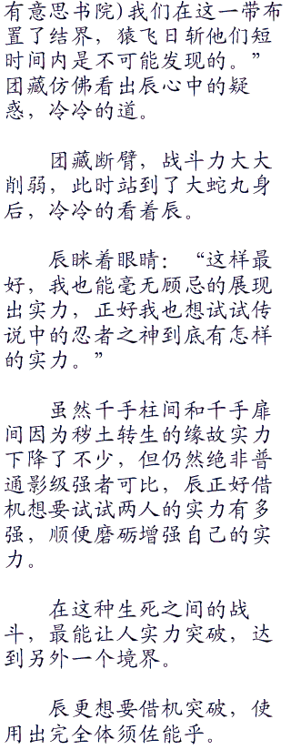 辰眯着眼睛,倒是不慌不忙:“初代火影千手柱间,二代火影千手扉间,果然是这样啊。大蛇丸,看来你最近研究的禁术成功了。”