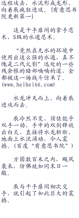 只见到在无水的环境中,忽地大量水属性查克拉涌现,连空气都变得潮湿起来,紧接着,巨大的水漩涡并扩散,水漩涡扩散的同时,从中心连续发射出无数上升的水流急速冲击敌人,以此进行高速