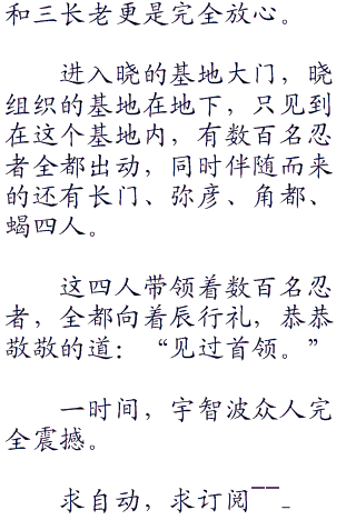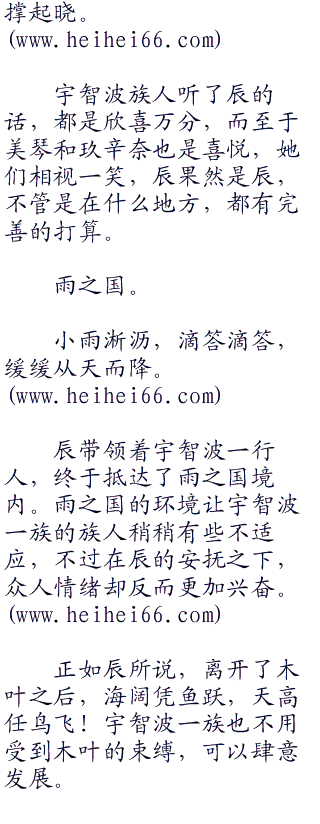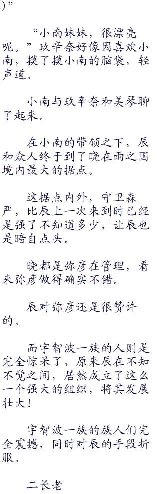 辰心里也很愉快,晓的力量壮大,但是相比于雨之国半藏的忍者部队来说还是偏弱。但有宇智波一族和辰的加入,那就完全不同了。