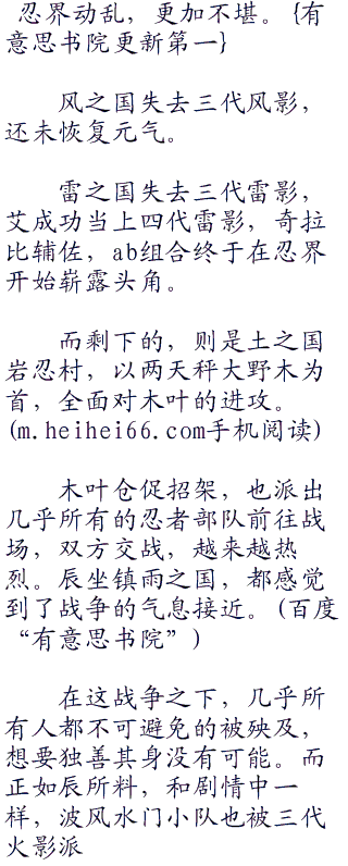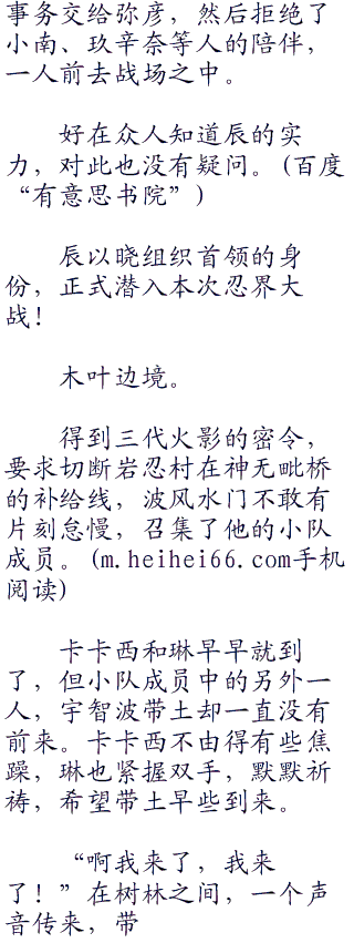 辰一笑,玖辛奈和美琴早就知道小南对他的情意,两女虽然心里酸酸吃醋,但也只有接受,谁都看得出来,小南对辰的感情只怕是深入骨髓,实属难得。