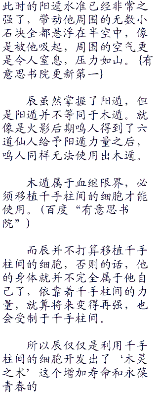 与秽土转生的千手柱间一战,辰并未感受到太大的压力,因为秽土转生状态的千手柱间力量被压制,许多堪称bug的木遁忍术,诸如:木龙之术,木人之术都不能使用,实力被大大削弱了。