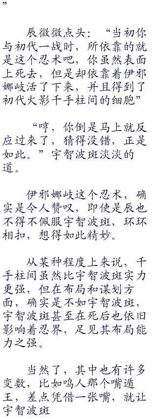 辰并不相信宇智波斑就会这么死去,宇智波斑也不可能为了这区区一场战斗而付出生命的代价。