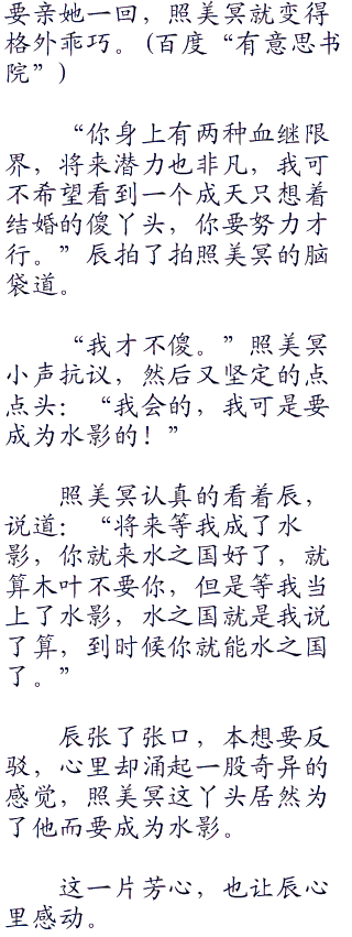 照美冥在得知辰叛村之后,就一直开始默默的收集辰的消息,可是却一直都没有收获,因此照美冥很疑惑,辰到底去哪里了。
