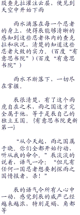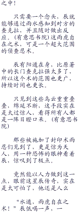 没错,辰所说的这个忍术,正是原著中的雨虎自在之术,也是天神道佩恩监察雨之国的忍术。
