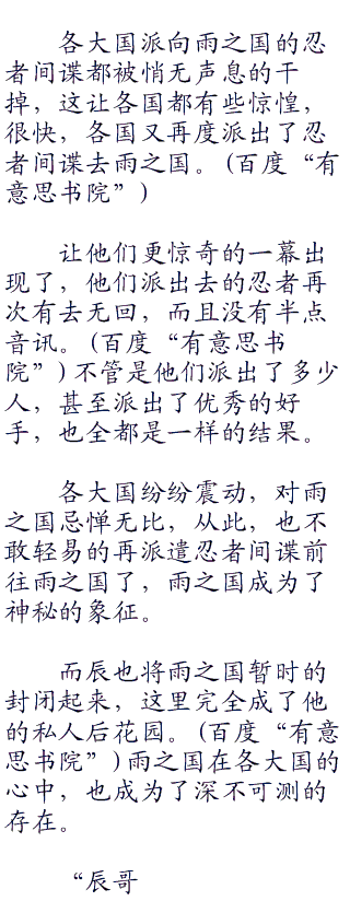 实际上在与大蛇丸战斗时,辰就感知到了不少忍者潜入了雨之国,各国的忍者都有,几乎五大国全都齐聚,是各大国派出来雨之国打探情报的探子。