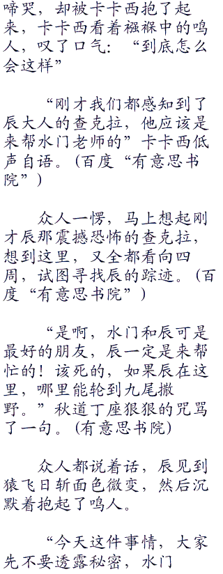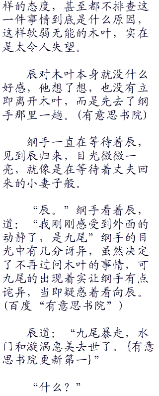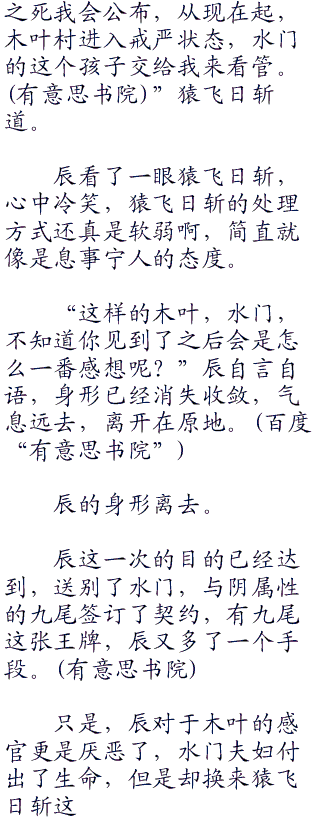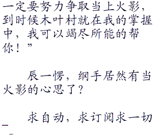 辰见到九尾离去的影子,不由得一笑,九尾在手,天下我有。九尾这家伙可是鸣人自带的作弊器啊,现在被辰得到了,实在是有意思。
