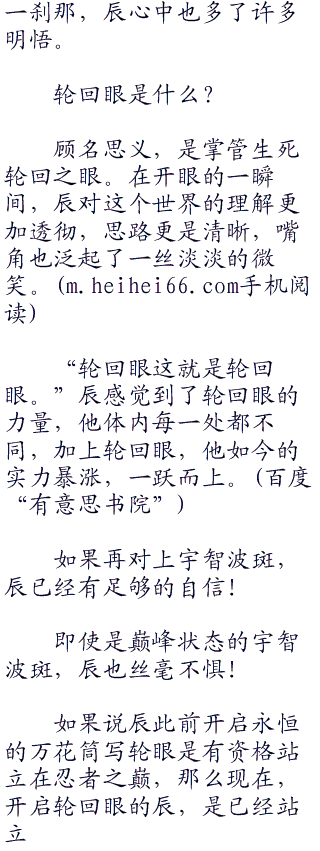 最关键之处是,辰的轮回眼与普通轮回眼截然不同。