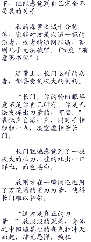 如果换做宇智波斑的轮墓边狱力量,只怕还能与辰相抗衡,但是同为轮回眼,长门的轮回眼并非是自己所有,所以使得长门的轮回眼的威力大大削弱,只能使用万象天引、神罗天征这些普通能力。