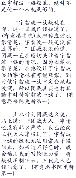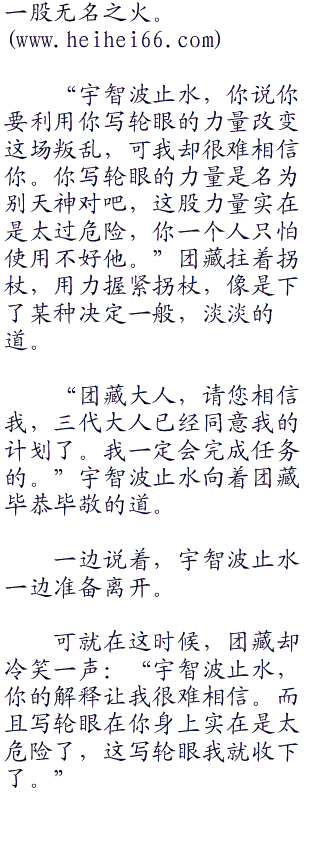 宇智波止水此时正在为宇智波叛乱一事心烦意乱,得知团藏找自己的消息,心中也惊愕,但却依言而去,不过心中却有几分警惕。