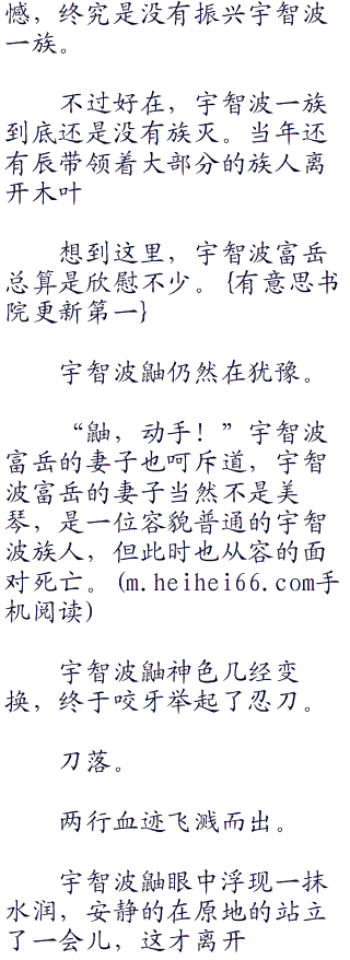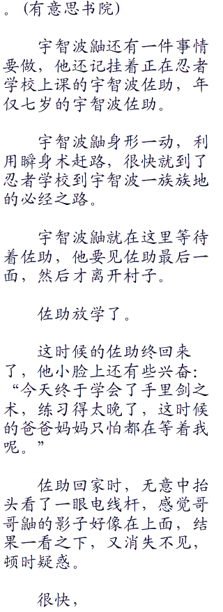 宇智波鼬此时仿佛麻木了一般,下意识的举起忍刀,再次将一名宇智波的族人杀死。有意.思书院首发