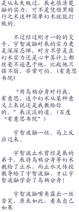 辰利用乌鸦分身,轻松躲避了宇智波鼬的幻术。