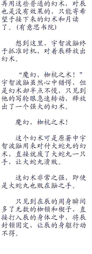 虽然宇智波鼬也知道辰的幻术实力很强,但是别忘了他可是有月读这个堪称**ug的幻术。