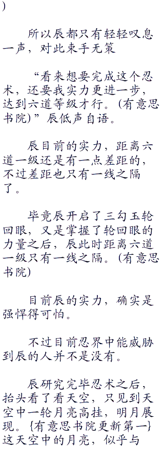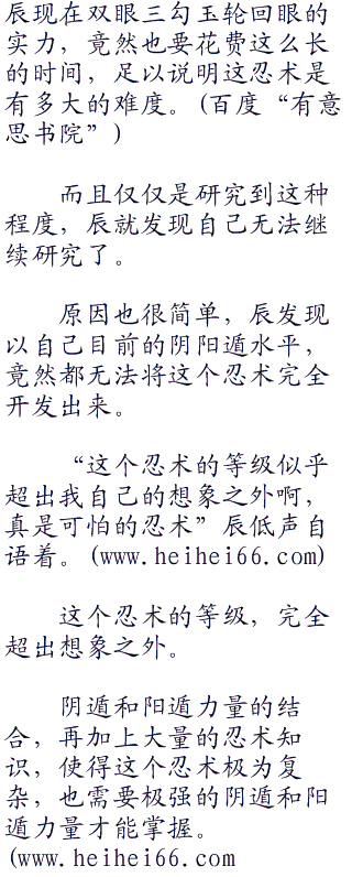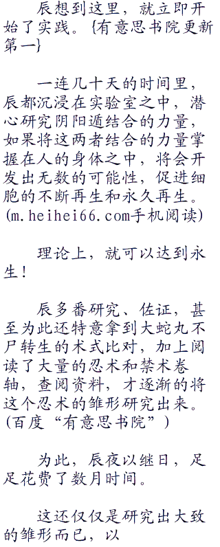 “目前得到永生的人,只有辉夜姬和取巧的大蛇丸两人。而其他大蛤蟆仙人之类的倒是不能确定,恩,尾兽的生命力也似乎是无限的,不过尾兽比较特殊,是依靠查克拉的力量而存在”辰心中暗自思索着,已经开始了研究永生之术。