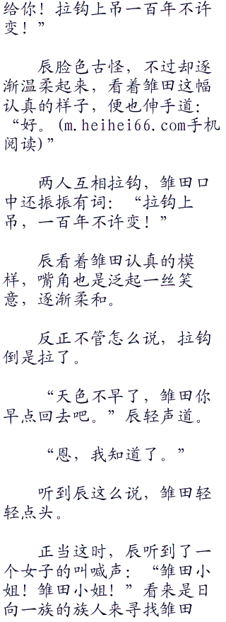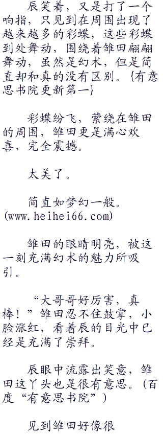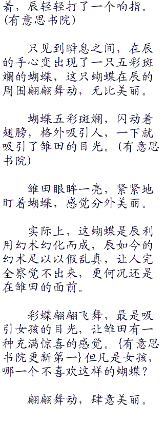 辰看着雏田尤带泪痕,知道雏田此时心情已经好了不少,但心里还是有些难受,便想安慰雏田,当即心中一动,想了想道:“雏田,我变个魔术给你看怎样,不用再伤心了哦,看我的动作。”