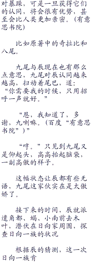 辰的手掌当然不像是九尾的手掌这样巨大,但是辰却也依旧很给力的拍了拍九尾的爪子,露出一丝笑意。