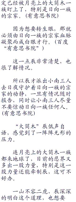 辰眯起眼睛,低声道:“看来这段时间内我要监视日向宗家的情况,以防不测。”