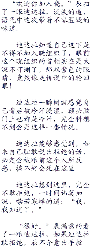 迪达拉越来越好奇,越是接触晓组织,就越是觉得神秘与震撼,对晓组织的那个首领也更是好奇。