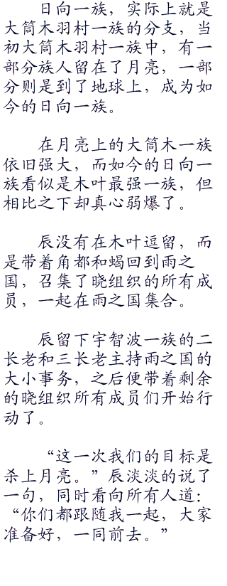 大筒木一族很强,这一点无需置疑,所以辰打算带着晓组织的成员们一同杀上月亮,毕竟月亮上还有许多大筒木一族的普通族人。辰对上大筒木羽落,至于晓组织的其他成员就交给晓组织的成员对付了。