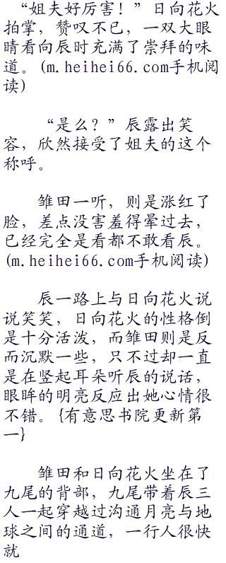 雏田倒是还好,但是日向花火却始终很好奇的看着四周,坐在九尾的背部,让日向花火感觉到十分稀奇。