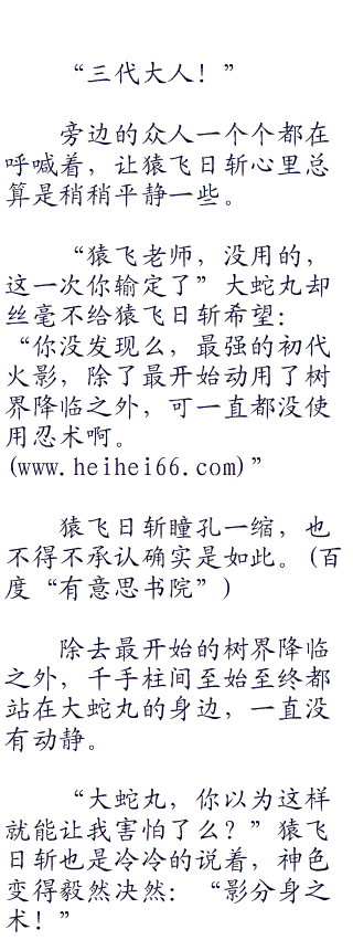 “大蛇丸,看来你已经彻底进入邪道了。大蛇丸啊,我今天就要断绝了你的心思,让你留在这里。”猿飞日斩仿佛是下定了某种决心一般,决心对付大蛇丸。hei.