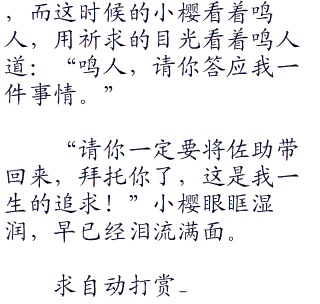雏田嘴角却流露出满足的笑意,她一点儿也不在乎辰是否知道,只需要心里惦记着这样一个人,心里就觉得很幸福。