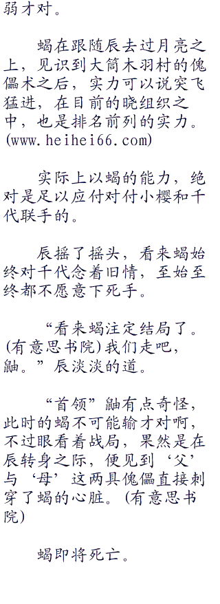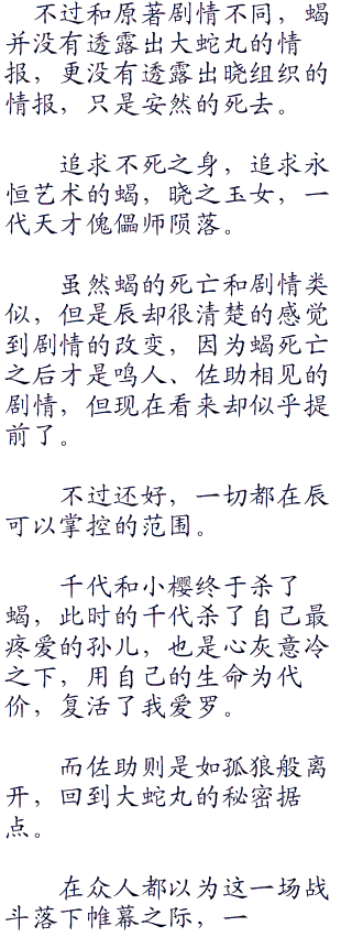 辰与鼬离开了晓的据点,这时候迪达拉已经离去,而似乎蝎那边还传来了战斗声音,所以辰打算去看看。.首发