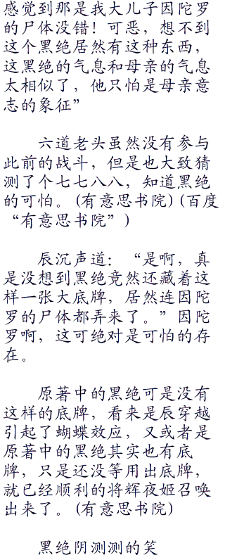 “嘿嘿,宇智波辰,你猜得没错。不过我的这具尸体可不是普通的尸体,你若是知道他的来历一定会大吃一惊。”黑绝冷笑一声:“这是大筒木羽衣之子,传说中因陀罗的尸体!这具尸体之中蕴含着惊人的力量,他实力绝强,甚至是你们宇智波一族的先祖!”