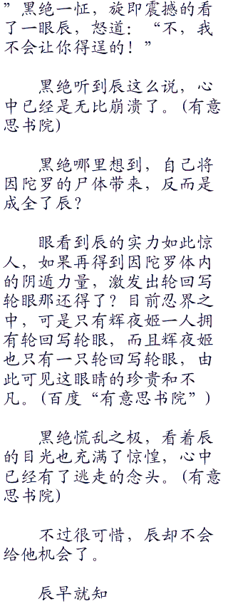 辰略带冷意的看着黑绝,道:“结束了,这一次我倒是要谢谢你。在这具因陀罗的尸体之上,拥有着强大的阴遁力量。只要我能得到这些阴遁力量,就能让我的写轮眼进一步进化,得到轮回写轮眼。”