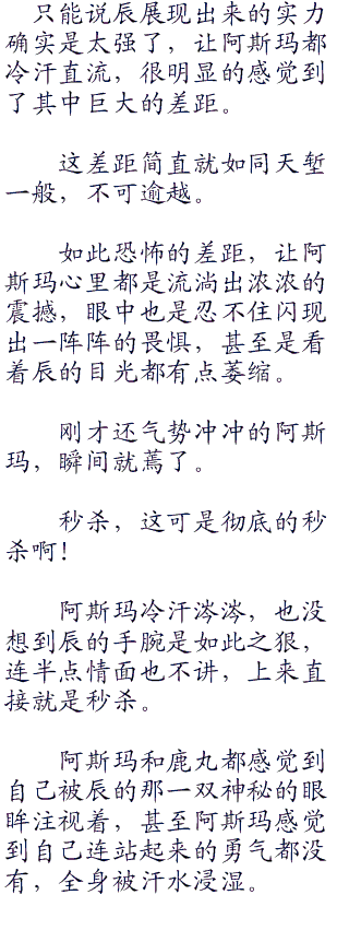 并足雷同和山城青叶更是愣愣的看着辰,眼中更是流露出几分骇然,他们面露土色,全身的汗水更是簌簌掉落,冷汗涔涔。