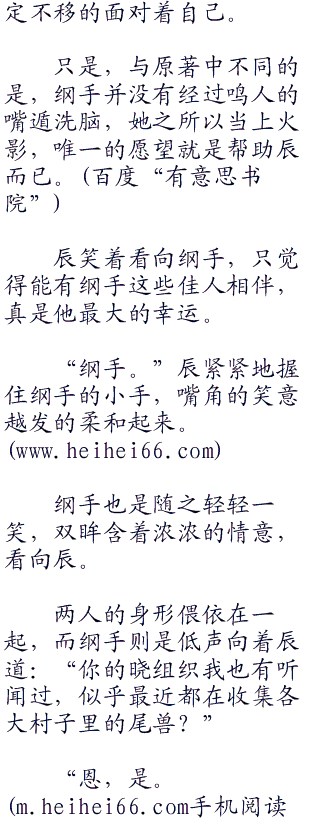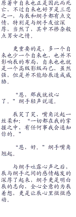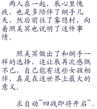 辰看着纲手,露出一丝淡淡的笑容道:“恩,我打算统一忍界。”