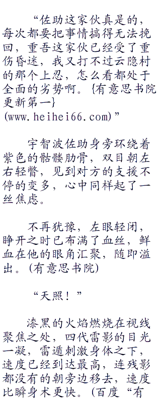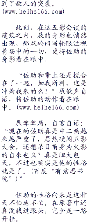 只有照美冥一人,心思并不在五影大会上,而是暗中思索着,不知道这一次他会不会出现呢,真是的,上一次就留了个消息就没影了,可是有好长一段时间没见到了呢。听他说这一次五影大会可能会出现意外,也不知道到底是怎么回事。