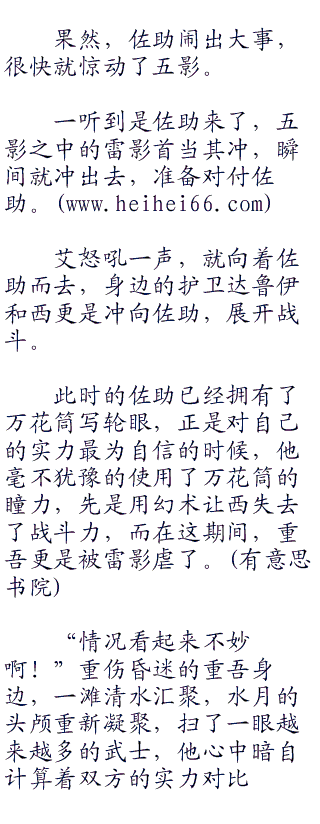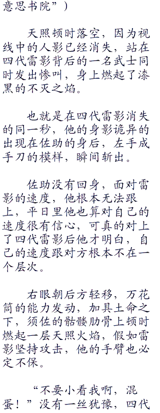 有武士中的队长也连忙上前,却在短暂的交手中被一剑穿心,此时,已有人前往五影会场通知他们遭
