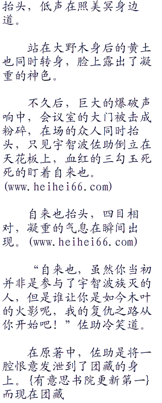 佐助缓缓起身,嘴角扬起一丝冷笑,“回头,真是可笑,在很早以前我就无法回头了,现在的我,眼前除了黑暗一无所有。”