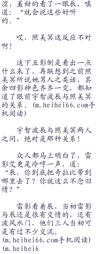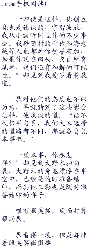 辰的目光掠过带土和几位影时,都是无比冷漠,唯独在看到照美冥时,也是变得柔和起来。