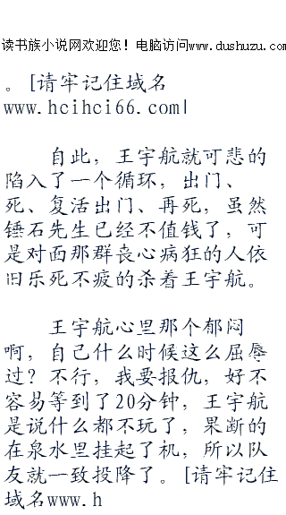 ;;;;默默的等待复活,然后走出了泉水,王宇航已经可以预感到自己悲惨的结局了,这根本不是一场战斗,而是一场1v9的屠杀。