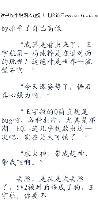 ;;;;“我觉得不是王宇航坑,而是王宇航的队友坑啊。刚才beby明显可以躲开皇子的技能,不过却没有躲,我算是明白了,这就是一场1v9的战斗。