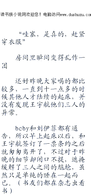 ;;;;王宇航迷迷糊糊的睁开了眼睛,感觉到身边的滑|腻感,顿时睡意全无,偷偷地睁开眼看了一下身边的两个女孩子,刘伊菲还在睡觉,而beby已经睁开了眼睛,同样在看着自己,不过现在又闭上眼睛装睡了。