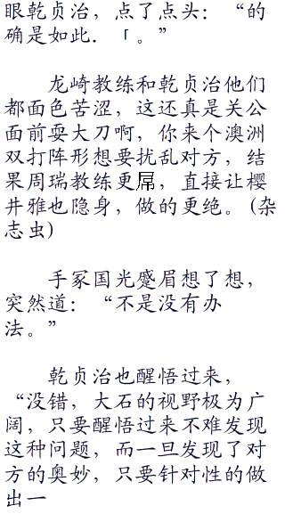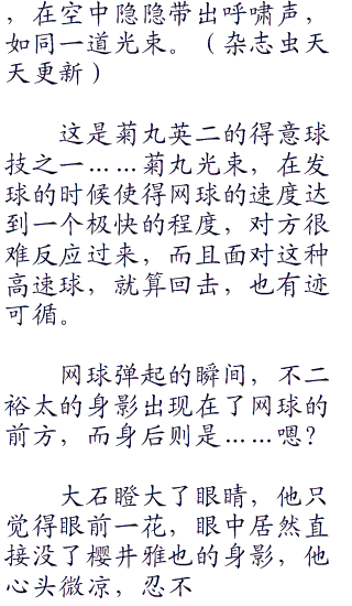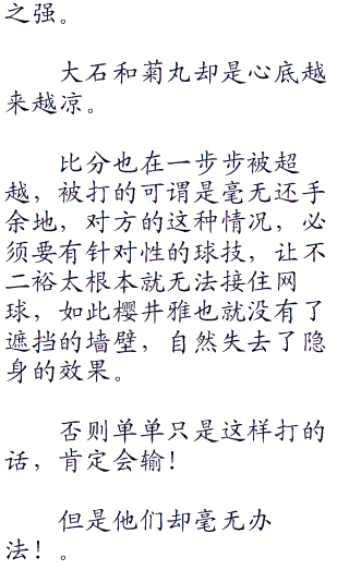 大石和菊丸开始是很谨慎的,但随着比分的拉开,也渐渐放松了心情,认为他们的球技也就是如此了,但很快他们就不会这么想了。