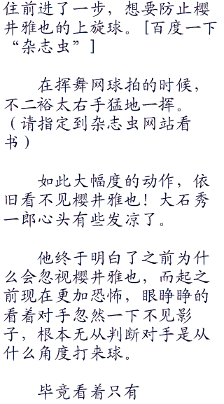 他们不相信,可事实就摆在眼前,大石和菊丸好似根本没有看见樱井雅也就站在不二裕太背后做出挥舞网球拍的动作,所以他们才全部都往左侧冲了过去。