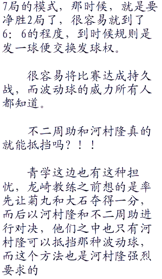 而最要“一三三”命的是,这局率先发球的是青学,也就是说他们占据优势后,哪怕之后一直输,但只要发球局一直得分,就能以6:5的分数战胜对方。