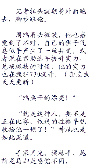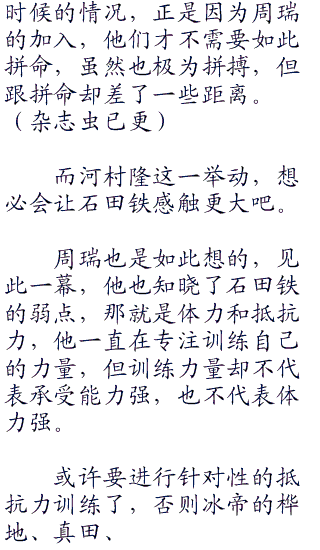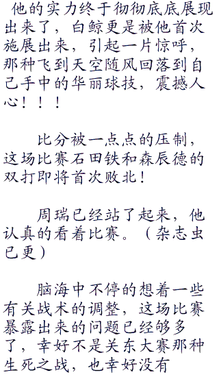以往一场比赛施展的波动球次数虽然也不算少,但是也在接受范围之内,05而这次为了跟河村隆对拼,短短的一分钟,连续施展了数次波动球,最后更是施展了三十式波动球,让他一时间难以缓过来,也能明显感受到体力的不足。