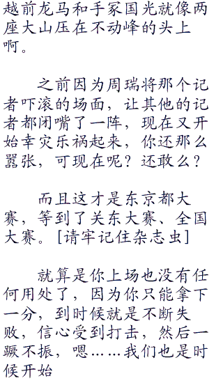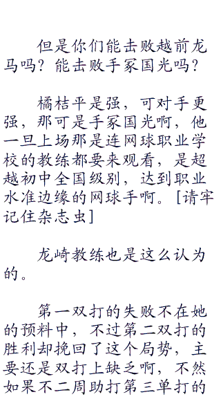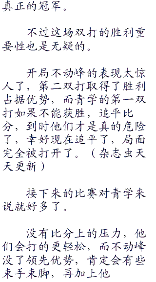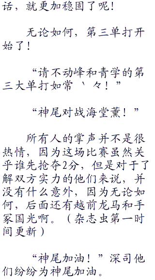 但发球局的消失发球太致命了,比分虽然接近,但一直无法追赶上,将对方拉扯到抢7局的程度,反观不二周助却是越大越顺,虽然面对石田铁和森辰德的波动球,他还是很难施展开,但是有些球还是能够回击的。