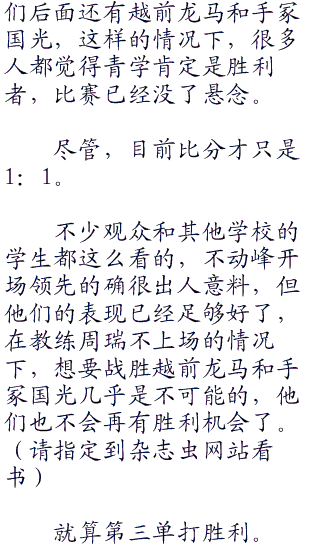 青学的学生都开始欢呼,只是欢呼声不算太激烈,毕竟他们现在仅仅只是追平比分,而不是大比分超越不动峰,1:1啊!