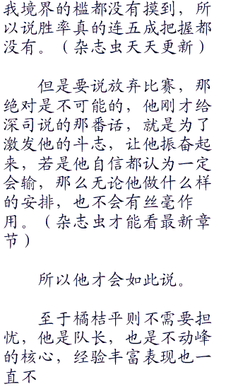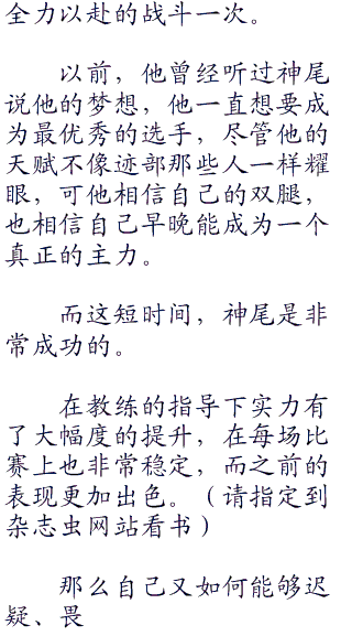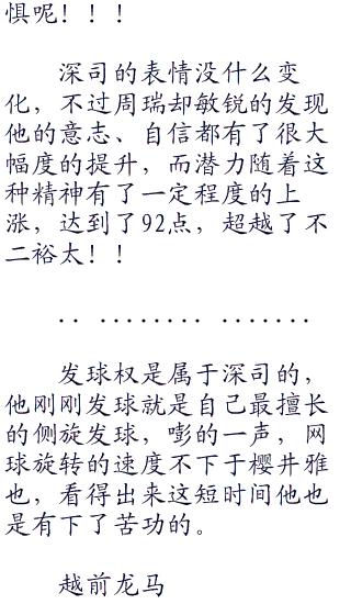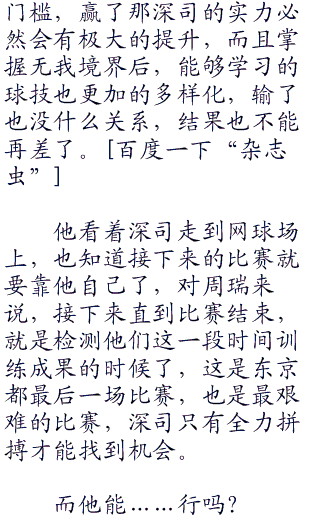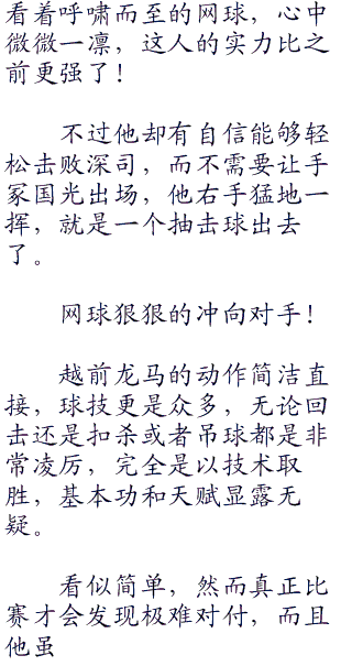 而接下来还有两场比赛,按照这个势头看,不动峰很有可能夺得东京都大赛的冠军,但真的可能吗?谁都知道接下来青学要出场的两个人有多强,手冢国光就不多说了,越前龙马在地区预选赛与周瑞表现出来的实力亦是极为的,尤其是这段时间,谁也不知道他进步了多少。