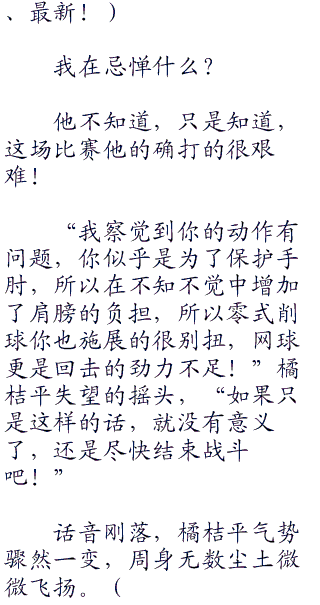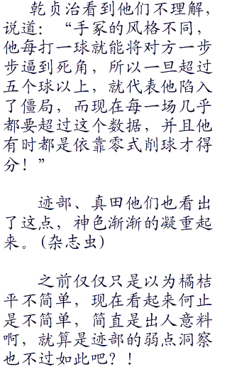 冰帝的迹部啧啧称奇,“不就是野性直觉吗?比起我可差远了呢!”他自信的昂起头,“而且别说橘桔平,就算是那个教练也不是我的对手哦。”