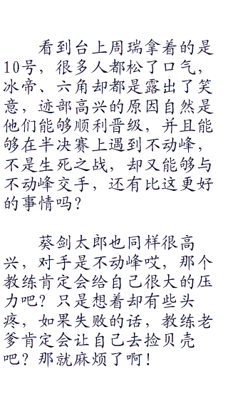 手冢国光却是微微攥拳,青学抽到的组号是跟立海大一起的,标志着他们要08是想要进入决赛就必须要跟立海大打一场,才能进入。