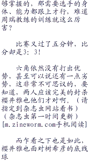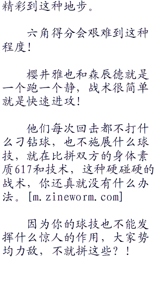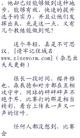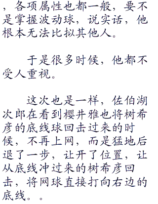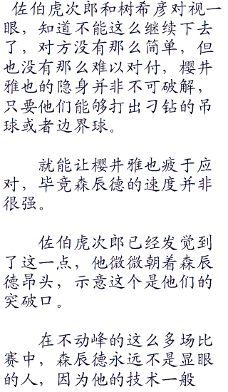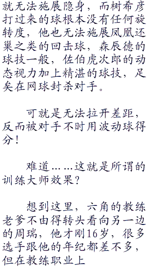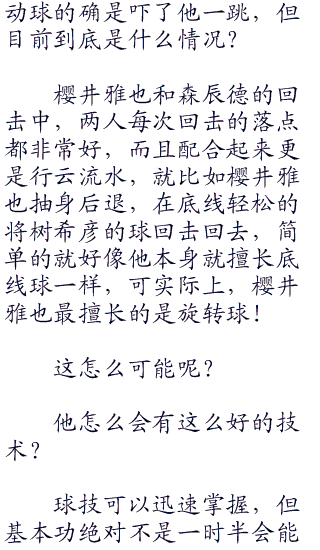 樱井雅也一上来就站在森辰德的背后,并非是直接利用隐身来反击,有时候还会自己跑到底线进行一些回击球,他的体力很不错,不停的跑动,寻找机会,把握节奏。