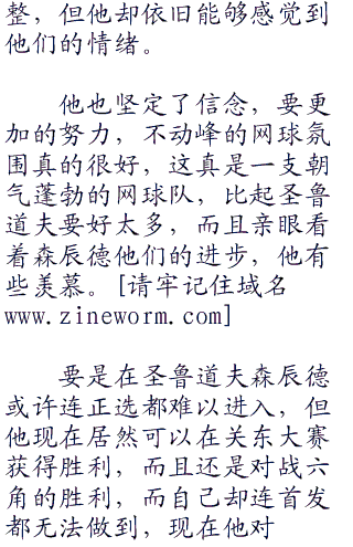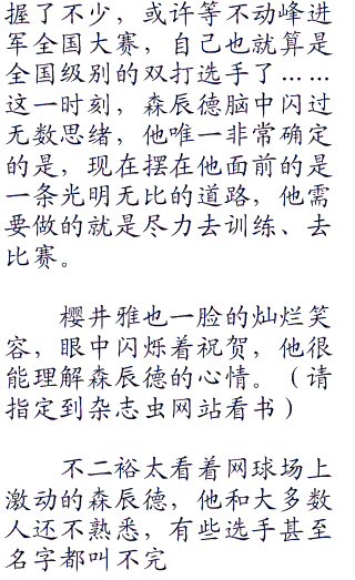 听着四周给自己的欢呼声,森辰德忽然觉得,自己也终于到达了这种地步,终于能够成为不动峰的中坚,而且在不动峰的日子真的很好,这里有信任自己的教练,有一群值得信赖的队友,自己的网球技术有如此进步,也让感觉到开心。