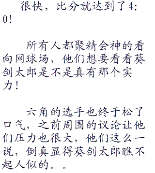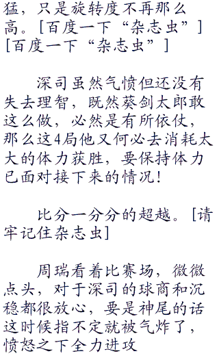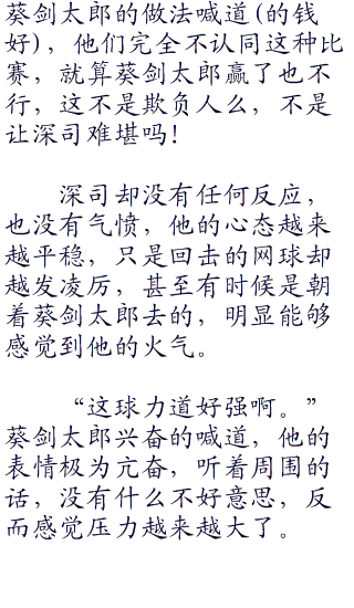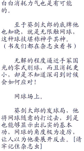 他们都知道葵剑太郎的天赋或者说那另类的打球风格,这家伙的实力没话说,就是有个老毛病,没压力就不会打网球了,必须要故意输4局或者输5局,才觉得过瘾,才能一边享受紧张感一边比赛,以往的比赛都是如此,最要命的一次,甚至是故意输掉5局,而且小比分也是40:0才真正认真打!