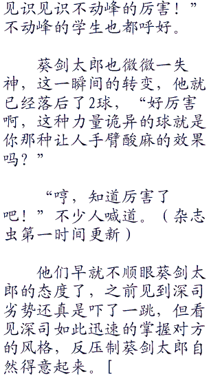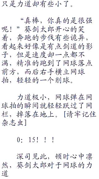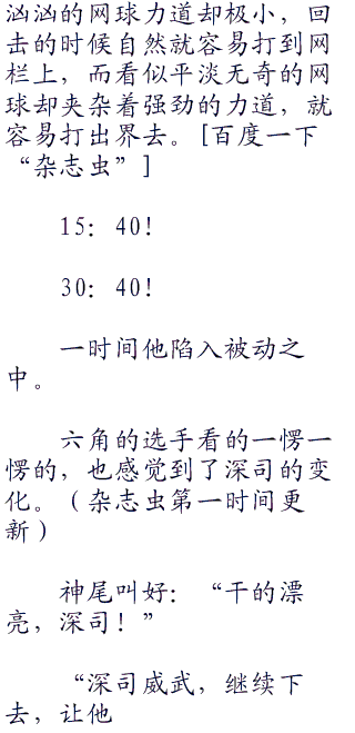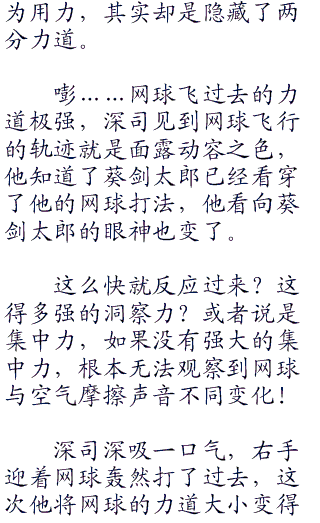 嘭的一声,网球的力道强劲的如同黑羽春风的直面球那般,而且速度更是极快,让深司一瞬间有种对面是神尾在发超速球的感觉。